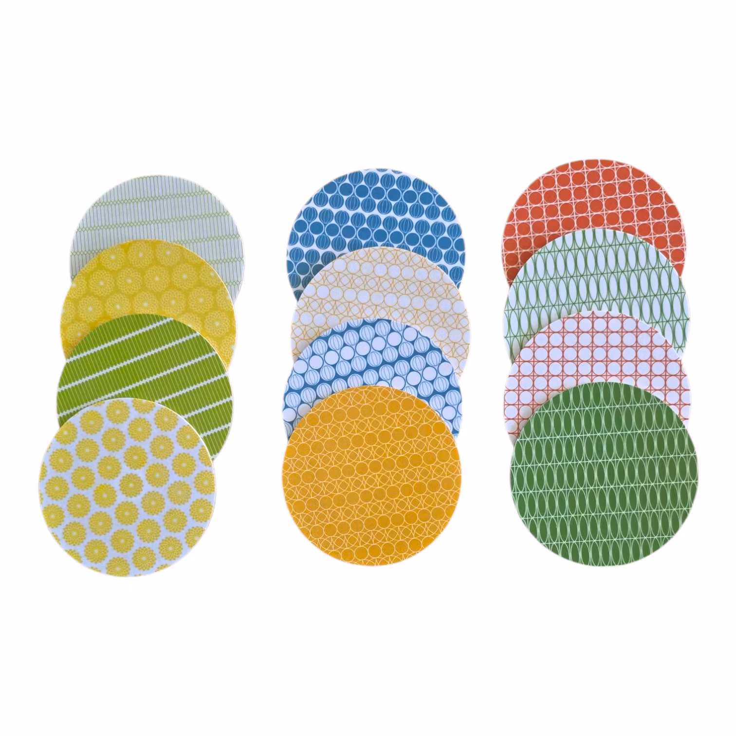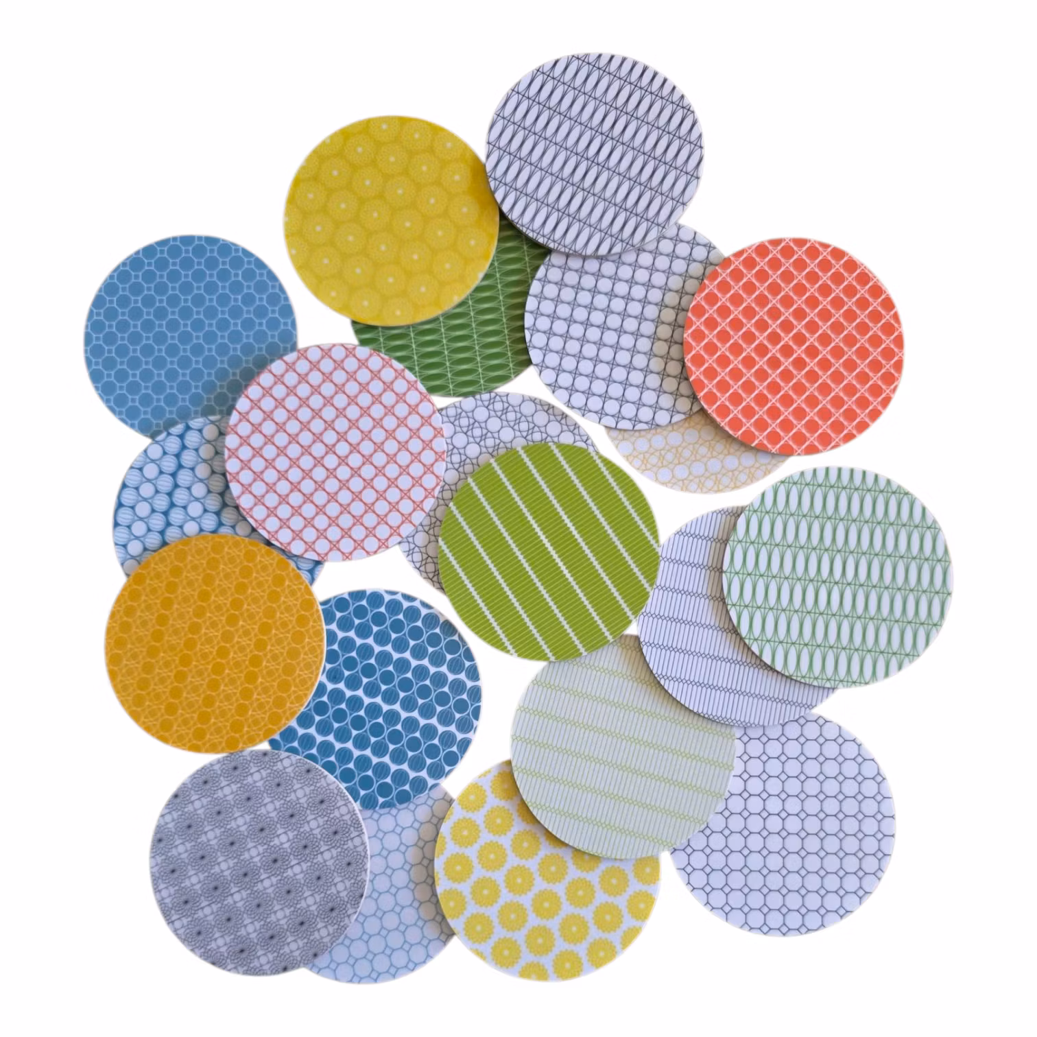 Runda glasunderlägg med unika mönster med retrokänsla, designade av mig Anneli Ohlsson, Från A till O. Kombinera gärna mina glasunderlägg på ditt eget sätt, efter färg, mönster eller som en galen palett av alla möjliga färger och mönster. På den eventuella festen kan det också vara ett sätt att hålla reda på vems glas som är vems. Glasunderläggen är hantverksmässigt tillverkad på Öland av björk från Norden. De är hållbara och tål värme. Baksidan är i björk.
