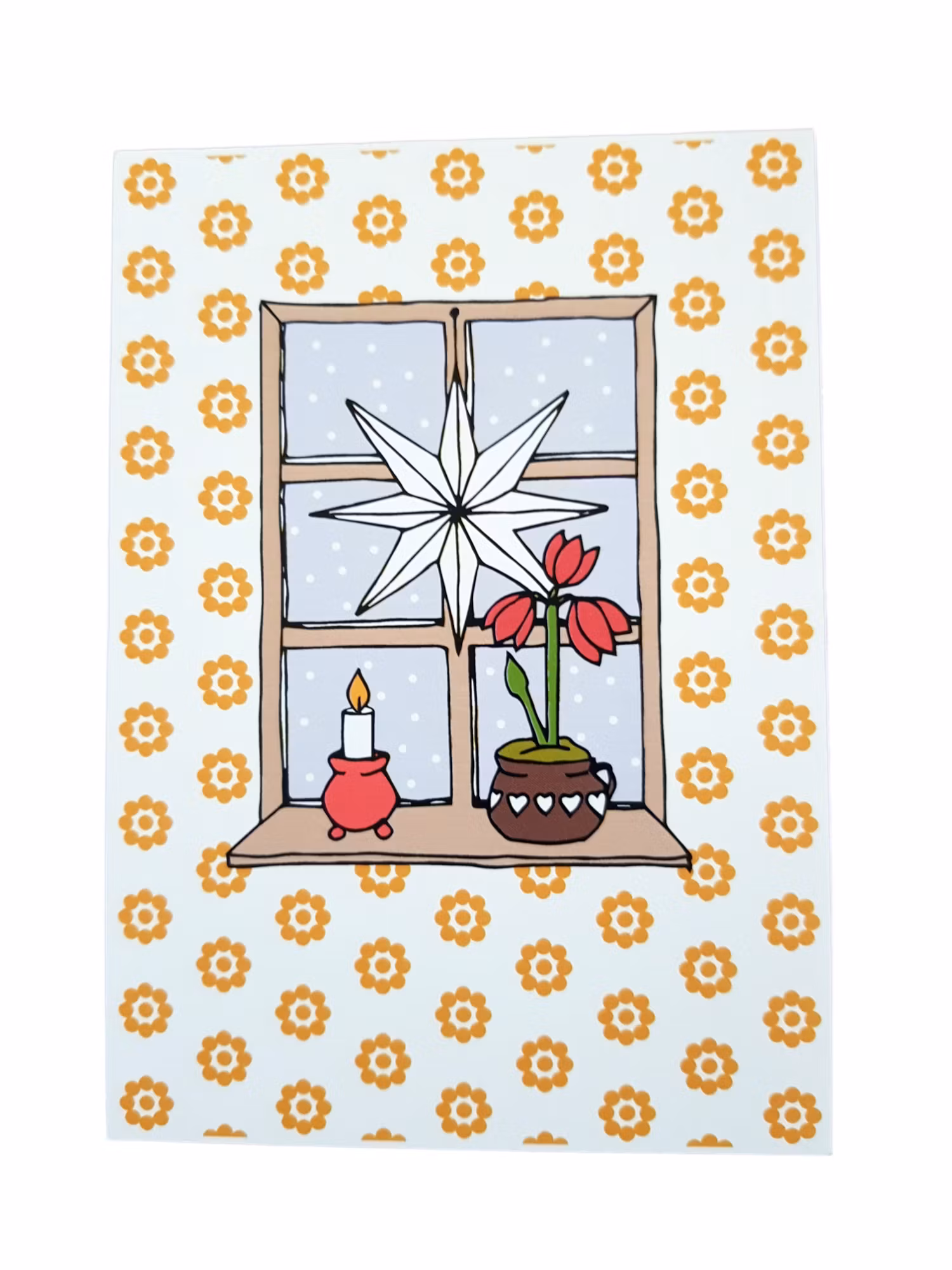 Julkort Adventsfönster i A6-format, med en unik illustration tecknad av mig Anneli Ohlsson som driver Från A till O